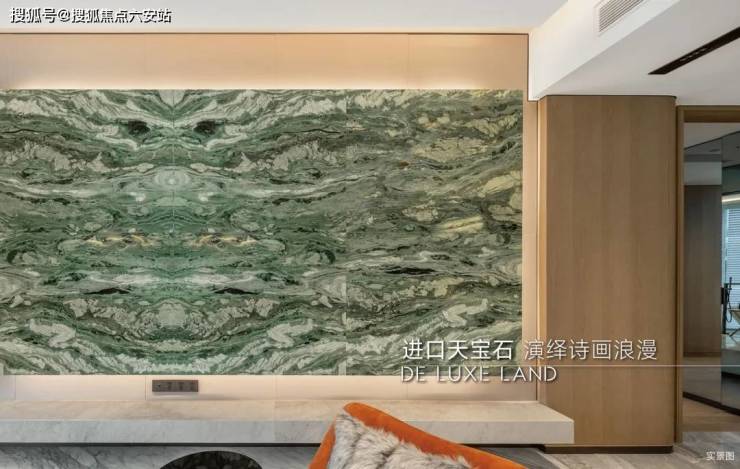 更令人眼前一亮的是,西边套户型的客厅背景墙,大胆选用了巴西进口石材天宝石,纹理和色泽犹如青山绿水般透澈明净,却压不住骨子里的绝代风华。