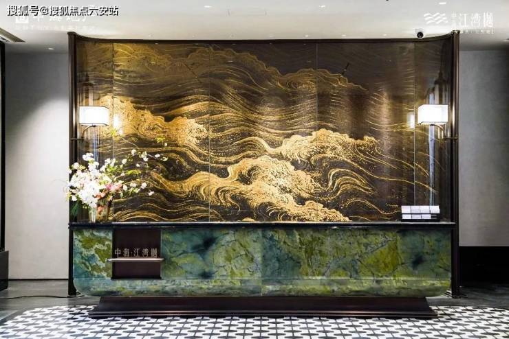 比如接待台前的金丝壁画,来自南宋画家马元的《十二水图》,描摹波澜壮阔的水韵,体现宁波勇立潮头的精神风貌。