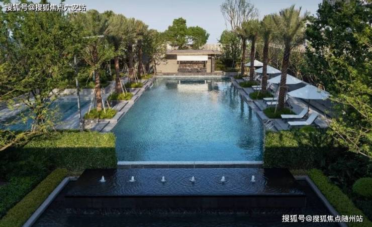 丛林掩映下,一片蔚蓝映入眼帘。泳池两侧分列着珍贵的银海枣,交错的乌桕木如天然伞盖,投下浓浓绿荫。