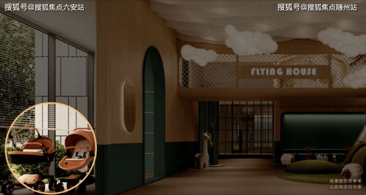 室内娱乐区以飞屋环游记为主题,门旁边有专门一块空间给孩子们放滑板车、儿童车、小背包,这实际上是要告诉他们,当整个空间变得更加的有序的时候,孩子们的情绪也会变得更加的愉悦、更加的稳定,这就是空间所营造的邻里共融。