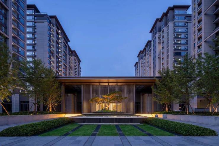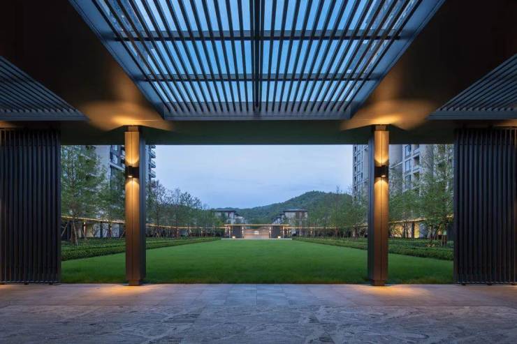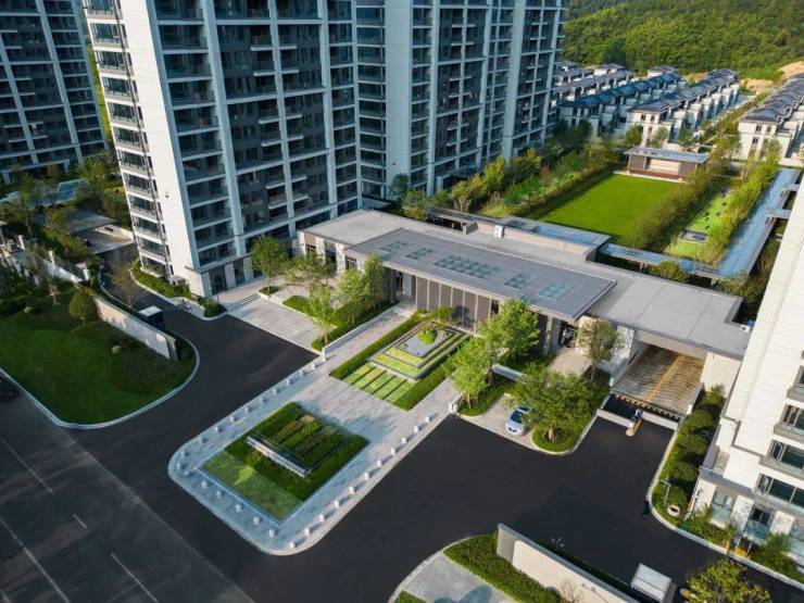 楼间距最大超过了60米。于是我们看见,超阔的楼间距,让园区内的每一栋建筑,都可以很好地保持相互的独立以及私密性,这样的尺度,不仅给多重园林的塑造留足了空间,本质上还降低了建筑对于公区的压迫感。