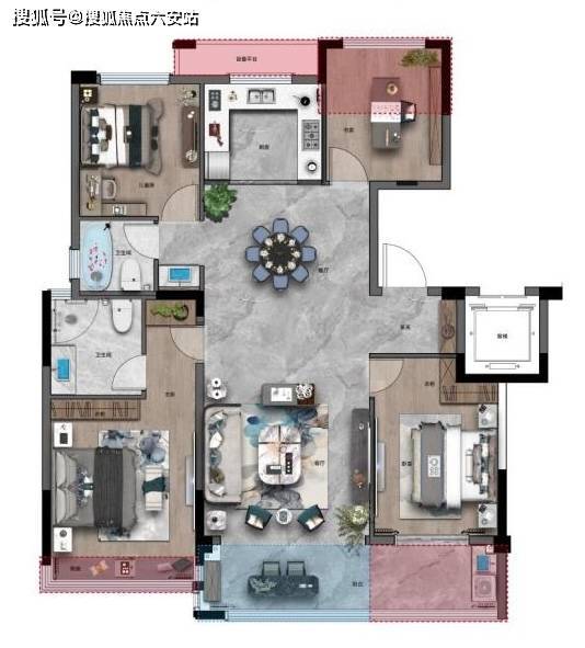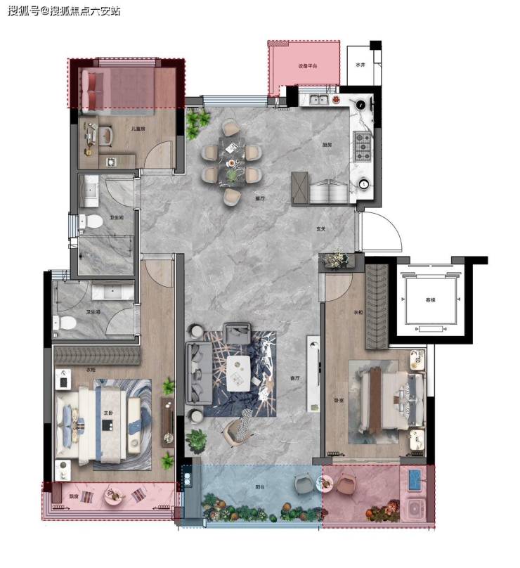 三室两厅两卫,总高8-11层花园洋房,全明户型,三开间朝南,南北通透,超高拓展面积,动静分区,超高得房率。