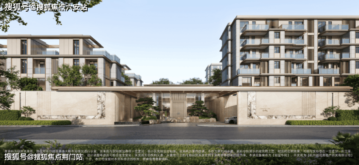 门头主入口的屋顶做了歇山顶的形制,延续了整个楼盘东方建筑的内核。底下大手笔铺满了大小高低不一的太行金老石皮,两棵价值不菲的黑松左右一站,那种山谷溪林的精致野奢感,一下子就油然而生了。