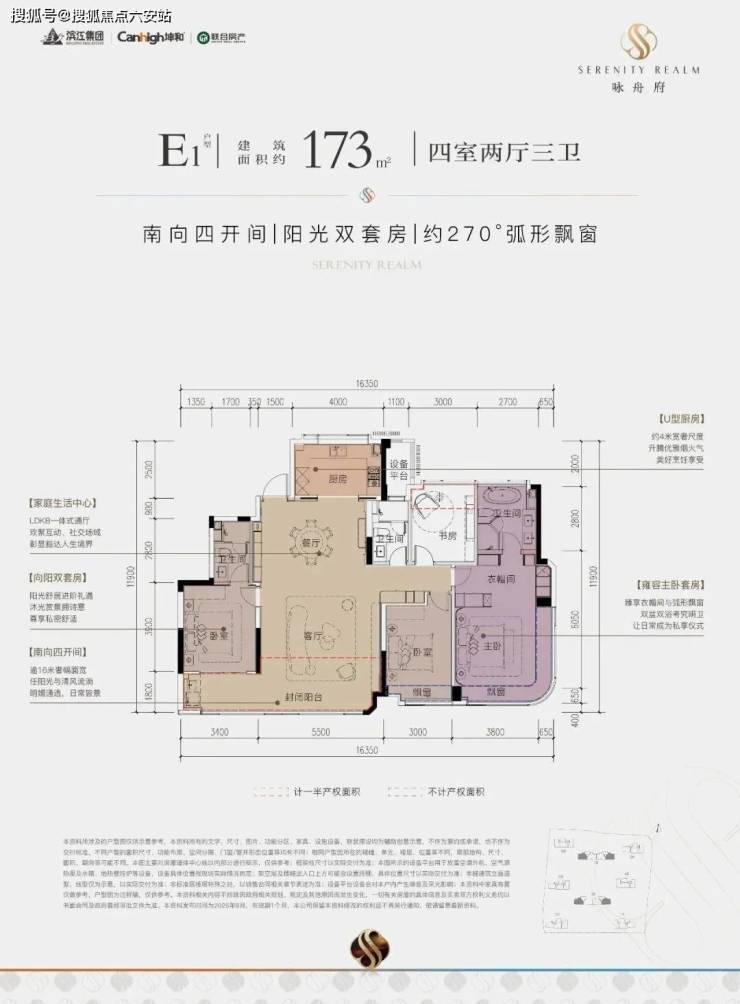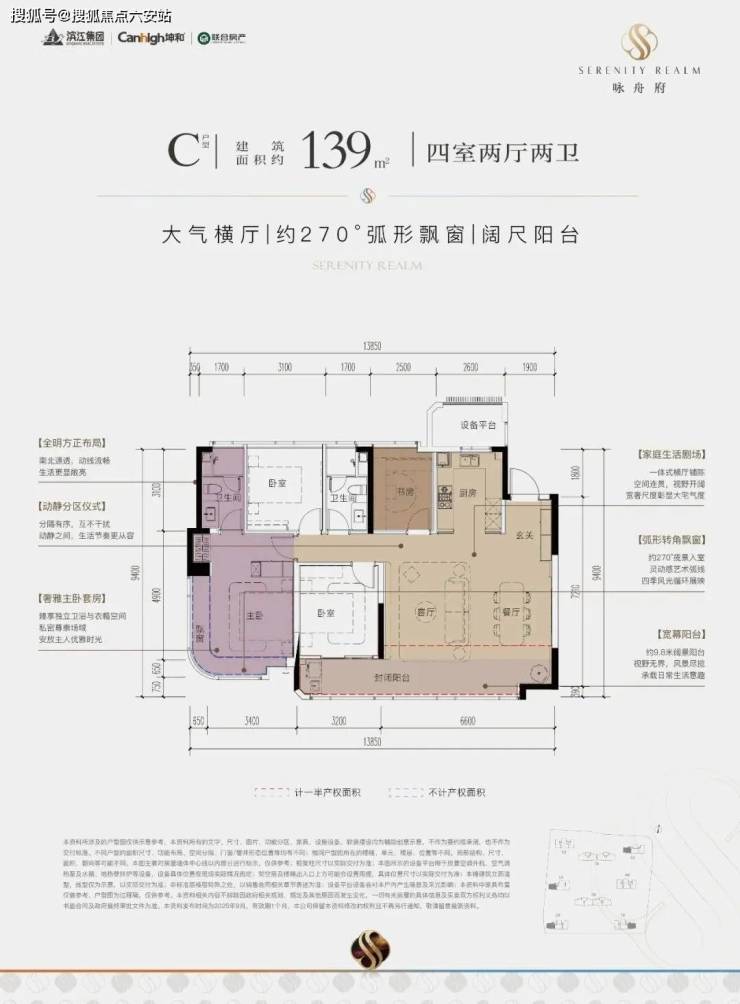 2. 户型革新:123-173㎡全四房设计,得房率88%-90%,139㎡横厅户型南向面宽13.85米,173㎡楼王配备星空露台与双套房。