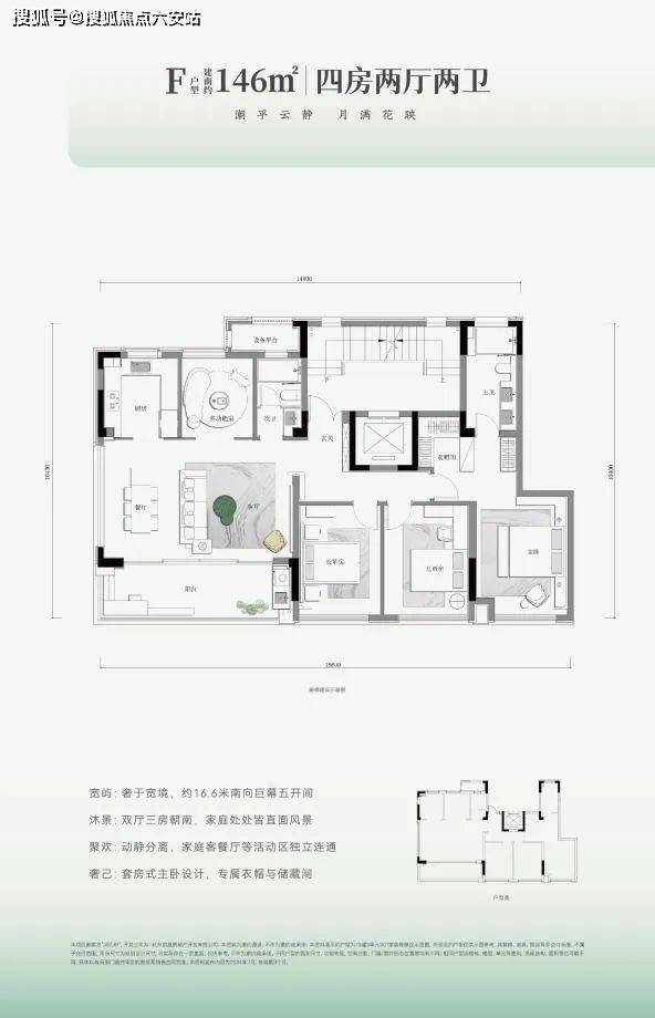 建面约146㎡做到了5开间朝南,大面宽短进深,南向阳台+飘窗面宽达约16.6m,可以做到双厅三房朝南,叠加浴缸、双台盆、休憩区等套房式主卧,这可是200㎡大平层才能达到的尺度。