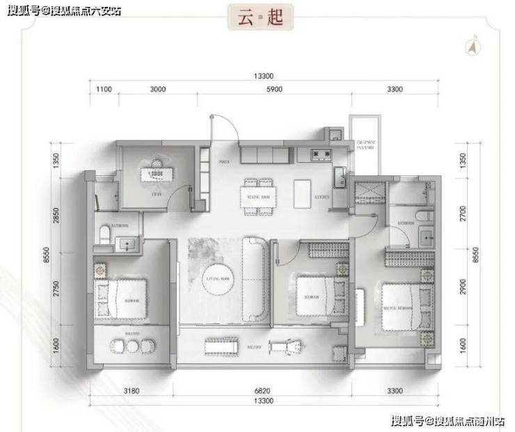 建面约139㎡户型:三阳台设计,呈现270°无界视野,尽揽天光云影;LDKB一体化空间联动,会客、餐叙、休闲自在流转;主卧尊享套房配置,私密与尊崇并重。