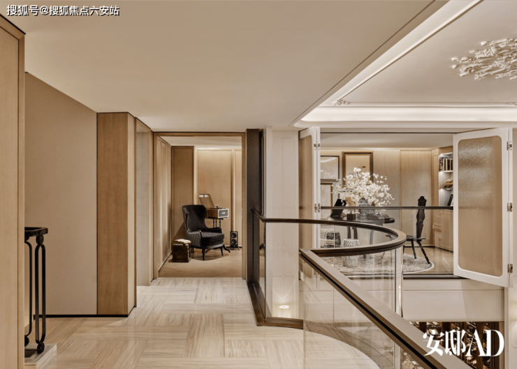 客餐厅地面采用希腊木纹大理石,独特的编织花纹拼贴工艺;卧室采用斜向鱼骨拼接拼花地板;楼梯采用玻璃扶手,弧形转角吊顶,勾勒艺术感空间细节。