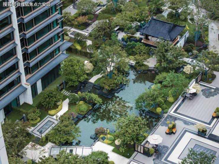 约930㎡礼仪园,表达“入园以礼相迎”之意,对称设计,罗汉松、卧石组成“两松定石”之境,将“石冠群山”、“砚国明珠”的歙砚造型居其中,给予业主生活无限的仪式感与尊贵感。