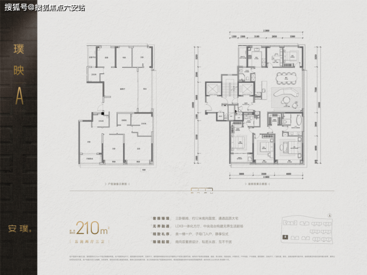 安璞的户型设计秉持“大宅尺度”理念,高层主力户型为210-280平方米的五房设计,全面满足高端改善家庭的空间需求。建面约240㎡、280㎡的五房均罕见地采用南厅布局,LDKB一体的大公区面积超过70㎡,消除了墙垛、横梁、门槛的视觉阻隔。