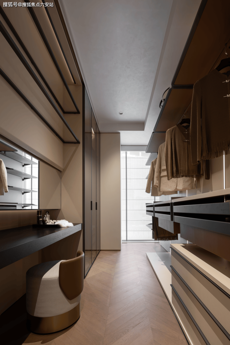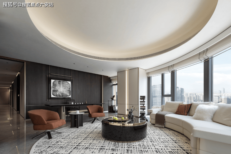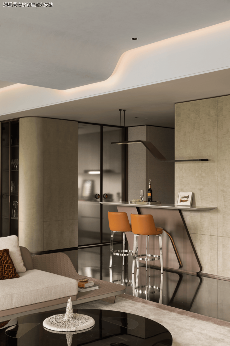 电梯门厅成为个性化表达空间。700方的整层格局,赋予设计师近乎美术馆级的自由挥洒空间,从恢弘阔绰的横厅到私密静谧的六大套房,空间叙事逻辑清晰流畅。