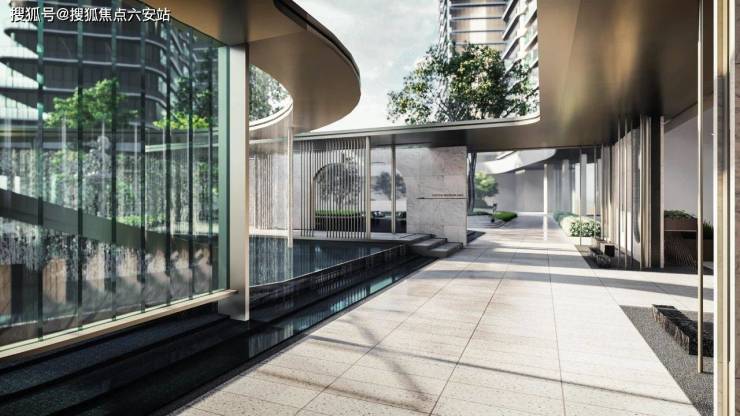 沿着风雨连廊穿过景观园区,不经意间遇见汀水会客厅,叠水石景、游鱼锦鲤,让人在游览中陷入片刻的微醺。就在这连廊中轴水月观景区,可直接观赏整个园区风景。