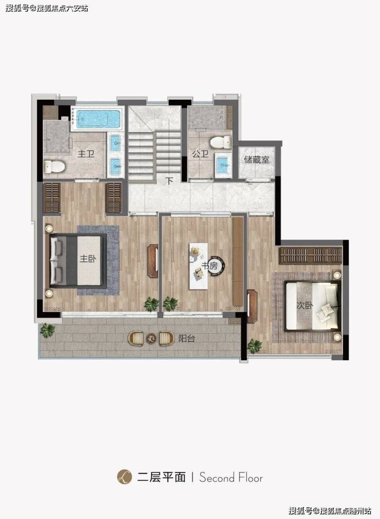 二层空间同样打造了约7.2米长阳台,二层设置了一个豪华套房主卧,以及一个次卧、一个书房以及公卫连通开间约4.2米的主卧与开放式书房,即使起居在二层,南向外接宽境阳台,可以眺望小区的园林美景。
