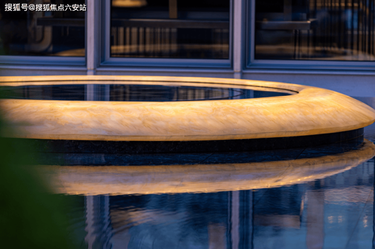 中轴水景宛如展开的宝石匣:池畔蓝翡翠奢石采自马达加斯加稀有矿脉,被誉为石材界的“爱马仕”。冰蓝底色中游动着亿万年前形成的云母纹路,水池中的采光井镶嵌的西亚白冰玉,透出朦胧光晕,与水面形成“镜中月、水中月、天上月”的奇观。