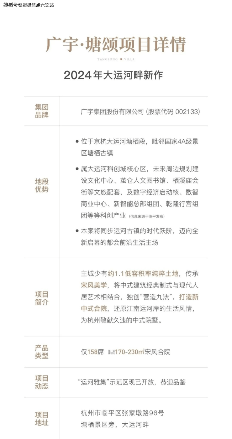 广宇塘颂,以**“运河绝版地段+宋风美学+传世合院”**三重稀缺属性,成为杭州主城2000万级资产配置的标杆。无论是自住追求品质传承,还是投资抢占城市发展先机,这里皆是不可多得的传世之选。**收官倒计时,恭迎品鉴!**