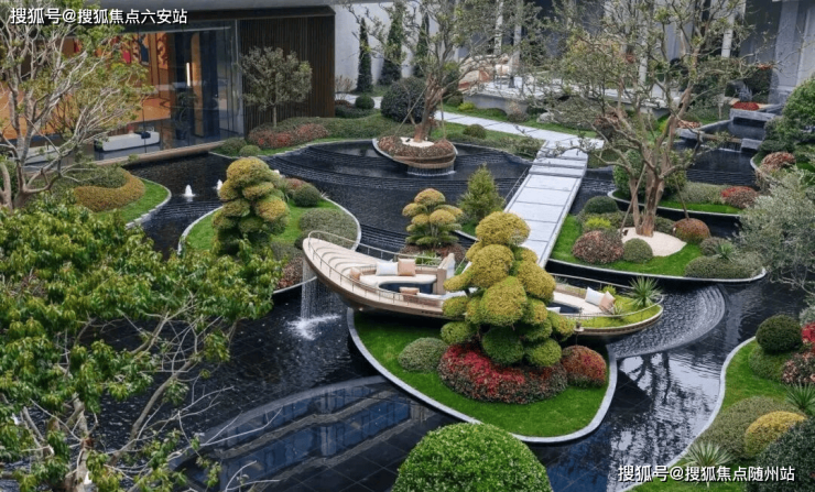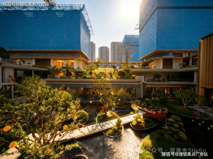 项目摒弃传统社区布局,打造“一轴·五境·七景”的叙事性沉浸园林: