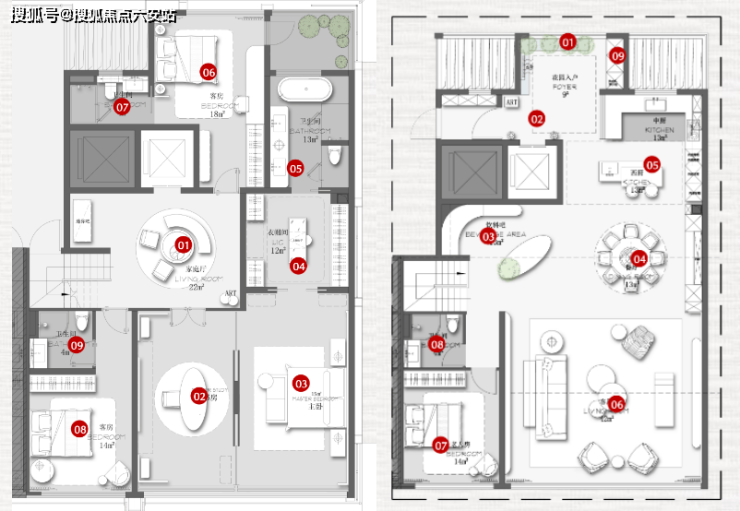 共6幢叠墅,包含上叠、中叠、下叠三类户型。户型设计包含私家庭院、电梯、地下室及露台等附赠空间,较高的空间附赠比例为业主提供个性化改造可能,通过引入自然采光与景观元素,增强室内外空间的关联性。