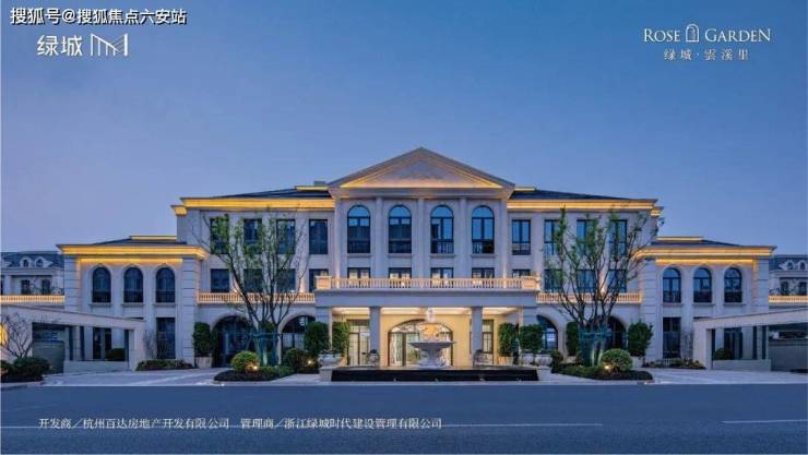 整个园区,以经典的绿城法式墅区景观大中轴贯穿,占地约1000多㎡,联排建筑的设计,融合了中国传统院落布局与法国枫丹白露宫的审美,外立面大面积采用全石材干挂,檐口等细节部位使用仿石。