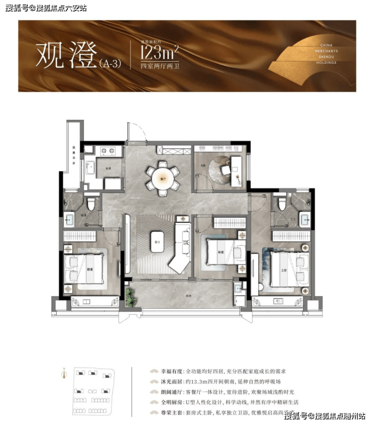 潮语臻境府高层主力户型为建面约123-168平方米,全部设计为四房舒适空间,实现了“全四房纯改善”的产品定位。每个户型均采用南向大开间设计,面面皆景,U型大厨房布局,得房率颇高。