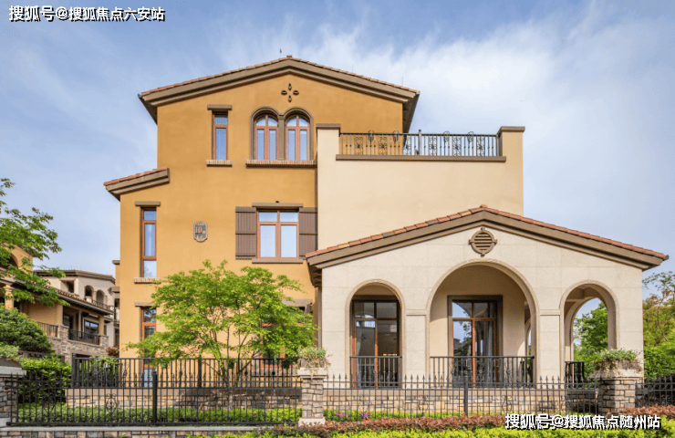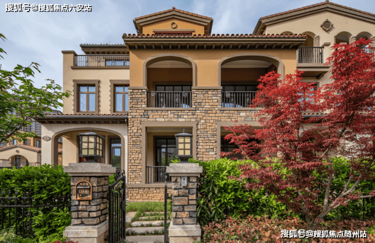 红瓦米墙、坡顶拱门、铁艺雕花等元素复刻南加州度假风格,坡地错落布局保证每户视野通透性与私密性。