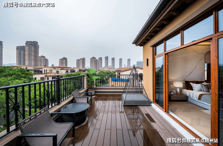 琥珀湾的外立面涂上了柔和的暖黄色,屋檐用一块块“红、黄、灰”三色瓦片填满,增添了层次感;每一扇窗都镶嵌着深色原木风格的窗框,室内和室外通过开放式的拱门连接,阳台用上了复古的铁艺栏杆,复刻原汁原味的加州风情。