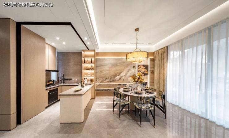 形成独具特色的鎏金立面,则让整个建筑瞬间变得通透轻盈。外立面用上石材的低密,在整个杭州都屈指可数。景观园林则是取源唐代大师李昭道《曲江图》,营造七境归家礼序,将自然山水在家楼下如画展呈。