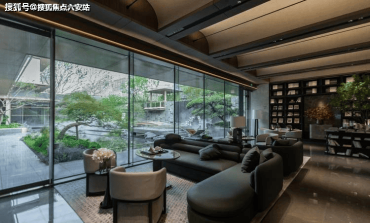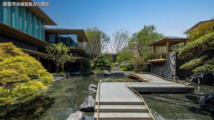 项目以《千里江山图》为灵感,将宋代园林的“深远”意境融入现代建筑,入口处黑金砂石铺就的“山岚”意境伴随流瀑蜿蜒,宛如宋画中的山水长卷徐徐展开,园中两株珍稀罗汉松冠盖如云。