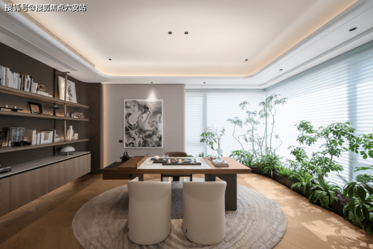 与自然共生,体验质感生活。客厅以米白和棕色为主色调,呈现出雅致而简约的空间氛围;融自然美学于现代高品质设计理念中,在绿意盎然的植物中延展出客厅空间的开放属性,定格家庭聚享时刻。