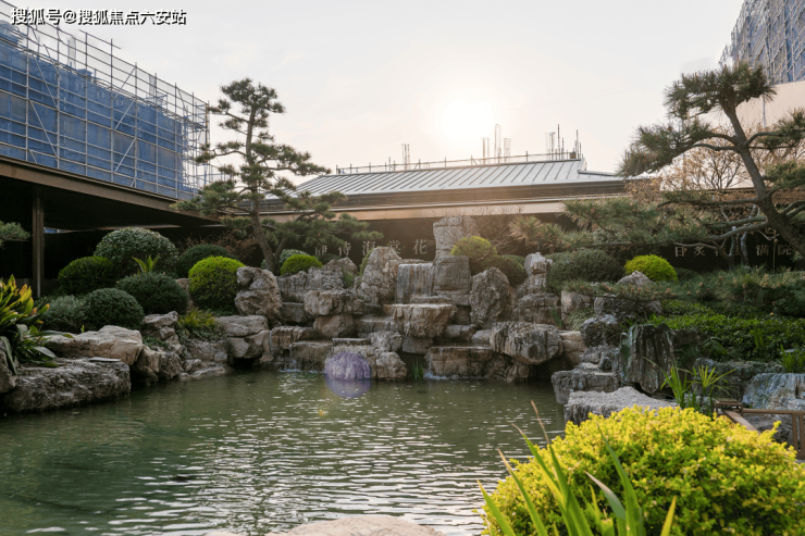 五棵精挑细选的黑松从溪涧中生长向上,山石造景的工法让水变得曲折,经过两重叠水,飞流直下,冲击出悦耳的白噪音和一幅李唐笔触下现代版的清溪渔隐图。