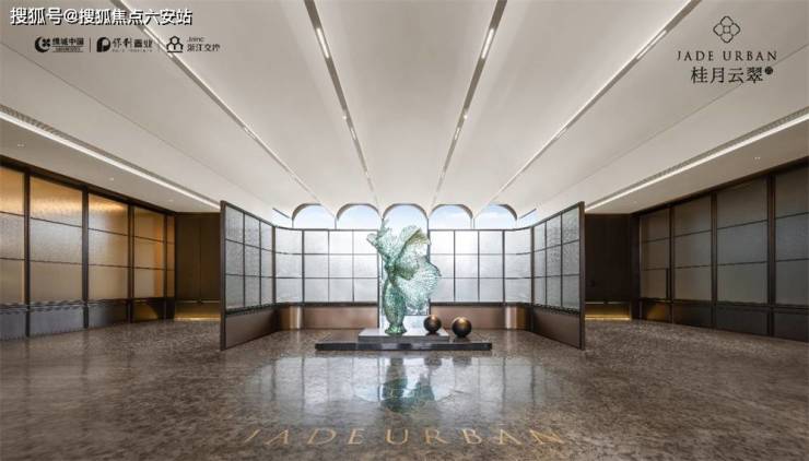 翠意流金的超50米宽、净高约6.45米的敞阔门庭,矗立一面艺术雕塑,在晚风中闪着荧荧微光,昭示着家的方向;沿着酒店式落客归来,中央迎宾水景、静水微澜与跌水如瀑交汇,塑造层层叠翠归家仪式,随之步入高奢酒店级大堂,铺展生活的序章。