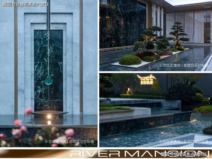 社区主入口的橱窗式景墙,巧妙地将吊坠造型与喷泉结合,动静之间,品味流转;水景会客厅廊下的艺术玻璃,以及前景水池的铺贴砖石,皆采用“宝格丽”门面的翠色系,散发玉石光感。