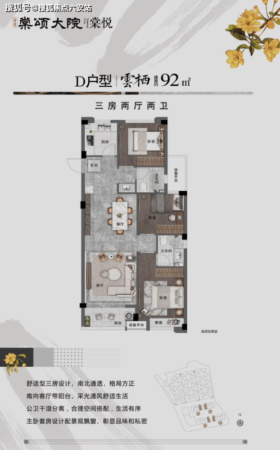 · 建面约95㎡三房两卫:南向双开间阳台,主卧套房配备独立卫浴与衣帽间,餐客厅一体延伸景观视野;