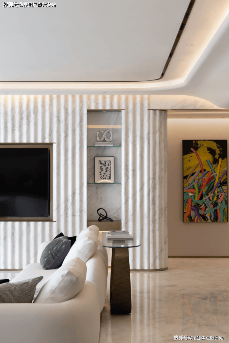 客厅背景墙融入水波流动般的曲面造型,转角处的圆弧处理,室内材质的对比呈现,大理石材的多样纹理、艺术家具的色彩碰撞,运用梦幻、艺术、时尚元素,共同延续新装饰主义NEO ART DECO精神。