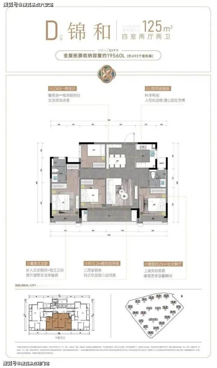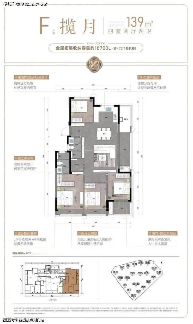建面约107㎡户型,则把重点放在舒适度上。阔绰方厅+双联阳台,通风赏景至佳,还有U型厨房,三面操作空间,动线流畅好用;套房式主卧更配置了步入式衣帽间,独立卫浴设计,保证了主人家的隐私和仪式感。