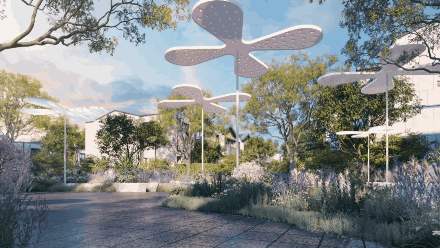 夏季到来,最为亮眼的大概就是联排区内以“小雪”为主题的景观了。区域内设置了一排形如雪花的雕塑装置,除了增加氛围感外,既可休息又能遮阳;白色的雪花雕塑搭配浓郁的绿植,在视觉上为炎炎夏日“降温”。