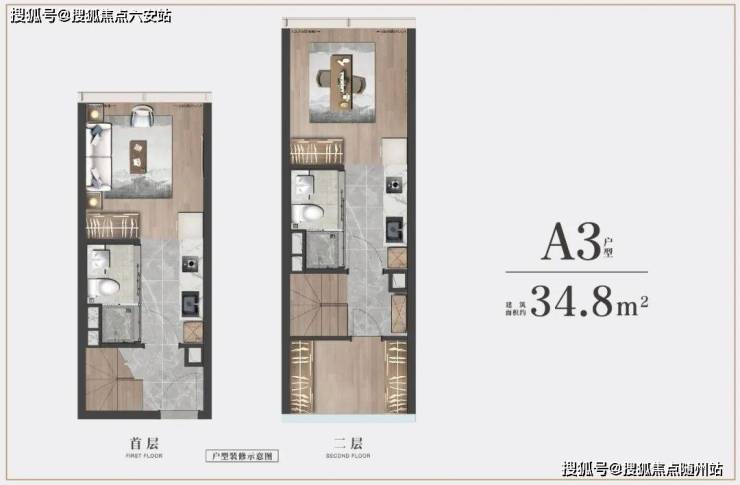 项目的核心产品亮点是约4.79米层高的双钥匙公寓,采用“买一层享两层”的创新设计。建筑面积约34-59㎡的户型,通过LDKB一体化设计和首层飘窗,减少墙体与过道面积占用,让小空间更显宽敞。