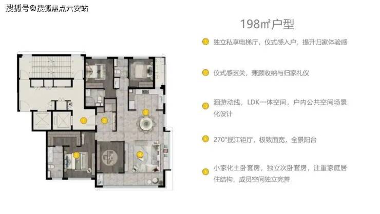 本项⽬楼王产品为198平⽶全景观江的端厅⼾型,通过南向阳台、东向飘窗的组合,使客餐厅区域获得了270°的全景观江视野。超大的玻璃窗分格设计,旨在使奉化江的美丽江景能尽收眼底。