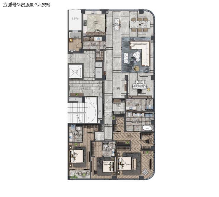 该户型最大的亮点,在于实现了动静空间的分割。一边是公用的客餐厅和多功能厅,另外一边是卧室。多功能房可做茶室、书房、瑜伽房,也实现了与客餐厅的动静分离。近100平米的客餐厅,是开 Party 的理想场所,亦可用来做沙龙、家庭轰趴、宴请宾客等,满足当下都市人的多种需求。