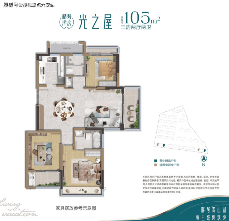 项目位于临安锦北新城核心区,紧邻青山湖科技城,坐拥城西科创大走廊发展红利。总占地约3.3万平方米,容积率仅1.2,绿化率达30%-35%,由8栋精装洋房与11幢坡地联排组成,容积率仅为1.2,是区域内罕见的低密氧生社区。建筑采用新中式风格,外立面以天然山水石石材与陶瓦坡屋顶结合,既保留东方韵味,又融入现代简约美学。