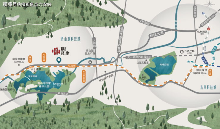 地铁16号线八百里站距项目约800米,4站直达未来科技城南湖站,6站换乘3/5号线至武林广场。科技大道、文一西路西延(在建)等主干道串联主城,杭州西站作为长三角枢纽,高铁30分钟通达上海、南京。