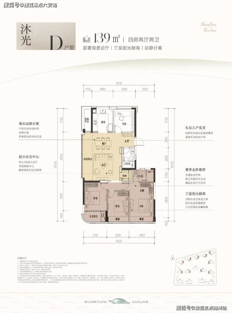 建筑面积约139m²D户型,同样也是四房两厅格局,相比124户型,每套都远离项目南侧主干道,私密性和环境更优,是高净值注重隐私客群的不错选择。南向3面宽,三房朝南阳光充足,家庭成员都有着独立的生活空间。连着约6.5米封闭阳台,可打造多个生活场景。
