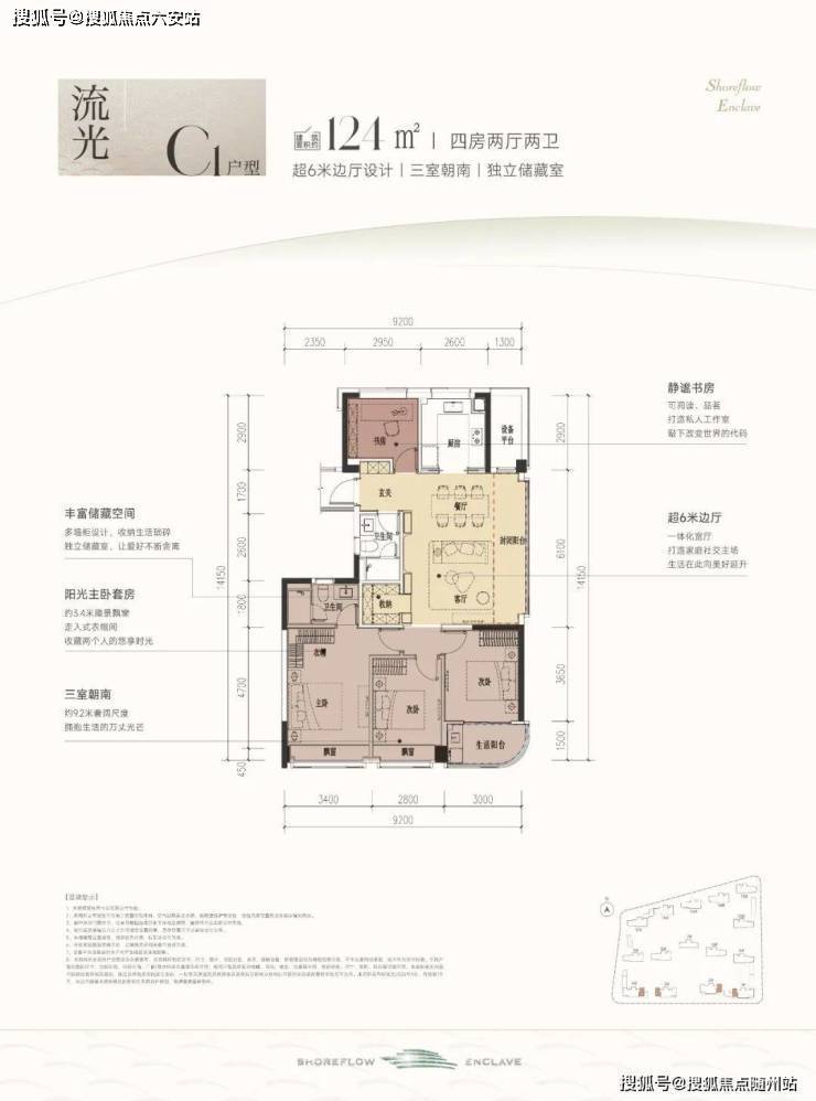 建筑面积约124m²C1户型,四房两厅格局,三方朝南+静谧书房,特别适合像家里有二孩且想改善居住条件的家庭。它最大的亮点就是,一进门便是大边厅,外面还连着个约6.1m的大阳台,让整个屋子采光特别亮堂。而且四房的设计,能让家里每个成员都有自己相对独立、不受打扰的私密空间。