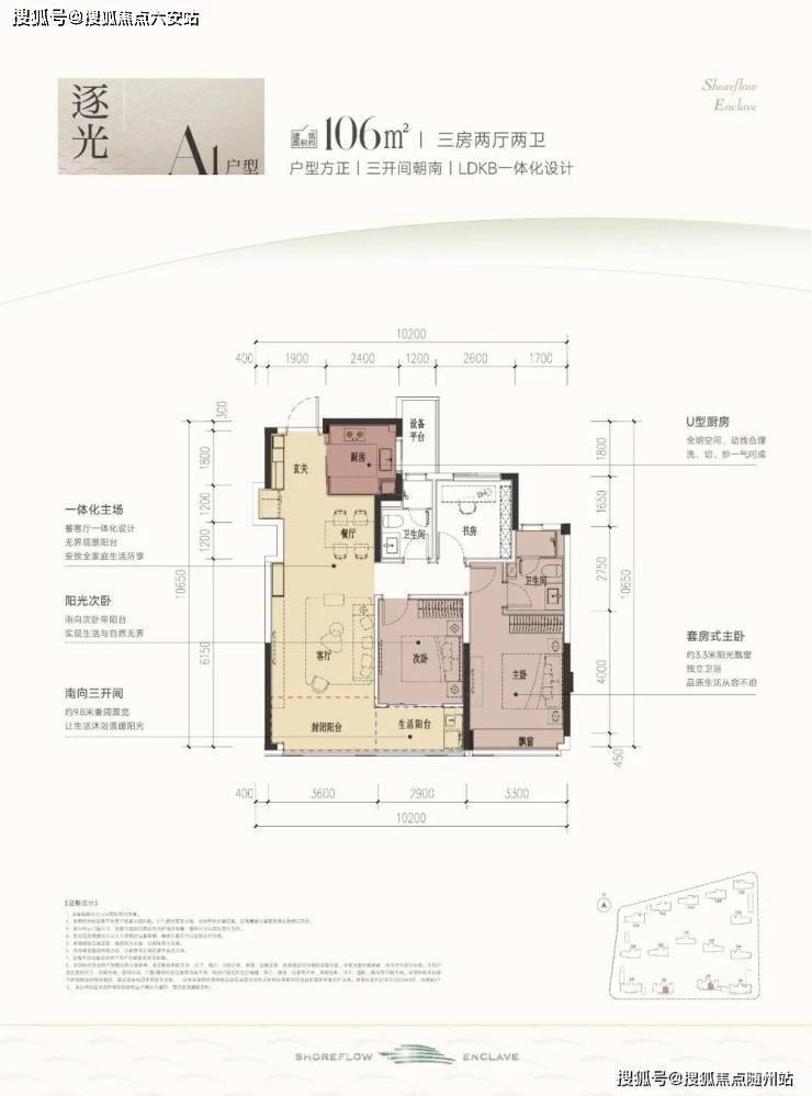 建筑面积约106㎡A1户型,户型方正,三开间朝南+LDKB一体化设计,基本没什么浪费面积。虽然是中间套设计,但做到了全明户型,通风效果好,可以说杭州少见。