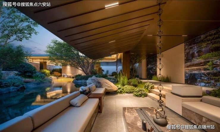入口处黑松迎宾,以太行金石皮摹写山水肌理,开启松间画屏的宁静序章。斗拱、榫卯、拱门等传统建筑元素与现代材料工艺相结合,演绎舒卷归堂的东方美学。约15米超尺叠瀑设计,创造出"银河叠水"的壮观景致,动态再现《溪山行旅图》的艺术意境,而下沉茶室静对流水,营造出"月映听泉"的幽静体验。