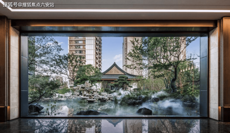 南北两侧,分立两座约46米宽、8米高(宽度含两侧景墙)的禅境中式大门,威仪棣棣气度不凡。此为第一进“登门望府”,光仪式感就傲视群侪。巍峨门楼两旁,照壁、石狮、罗汉松、涌泉阵列……中央的“鱼跃龙门”地雕,用的是芝麻白花岗岩,由江西名匠现场拼缝做旧打磨而成。