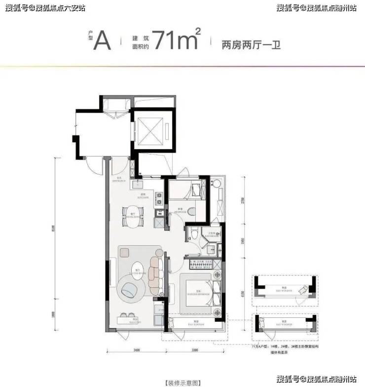约71㎡的两房两厅一卫户型是项目中的热门选择之一。该户型设计合理,南北通透,采光效果极佳。客厅宽敞明亮,与餐厅相连形成开放式空间,便于家庭成员间的互动和交流。卧室均带飘窗,增加了采光和通风效果,同时也为居民提供了一个舒适的休息空间。