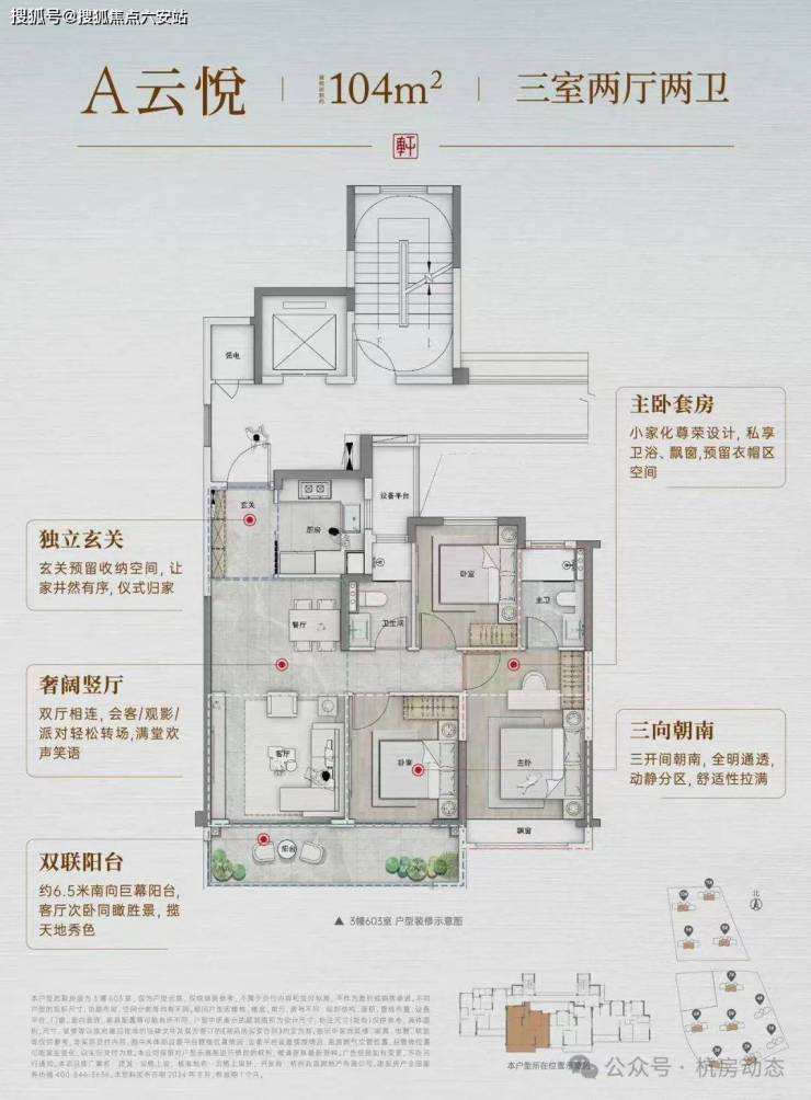 • **约104㎡三房**:动静分区双卫设计,6.5米凸阳台实现采光隐私双优,玄关800库收纳体系满足三口之家需求;