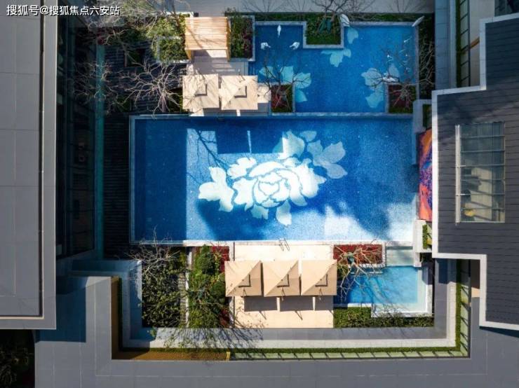 最别出心裁的是,戏水池南面还精心构筑了一座“瓦当流水”:一片片青瓦错落叠交,勾勒出一排古色韵深的“屋顶”。潺湲的流水自青瓦汩汩而下,为这片漫溢度假风情的下沉会所,注入了几分江南的诗意。