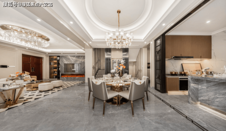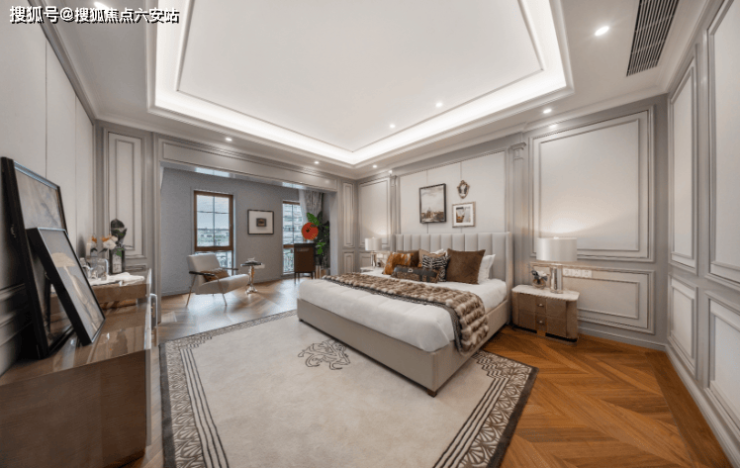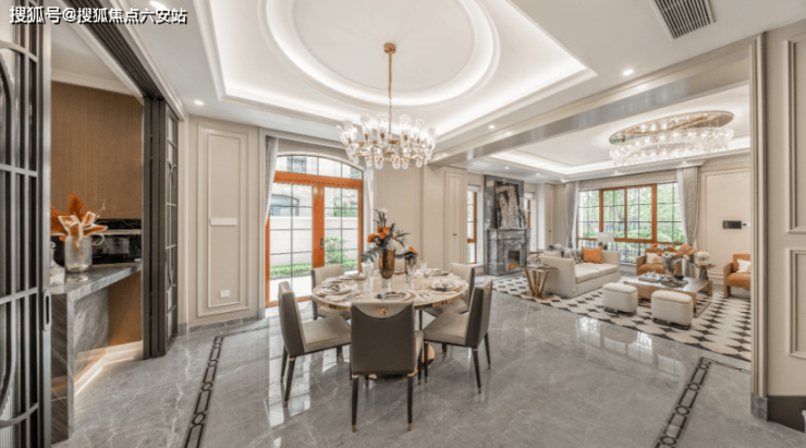 建筑采用全石材干挂外立面,搭配雕花廊柱、老虎窗、斜坡屋顶等经典法式元素,复刻巴黎庄园的优雅气质。室内层高设计科学,一楼3.4米,二楼、三楼均为3.2米,既保证了空间的通透感,又增添了居住的舒适度。