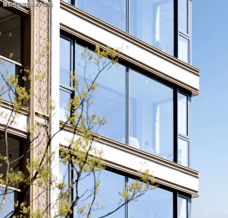 烫金立面:真石材+香槟金铝板,辅以香槟金金属线条,成板块建筑封面