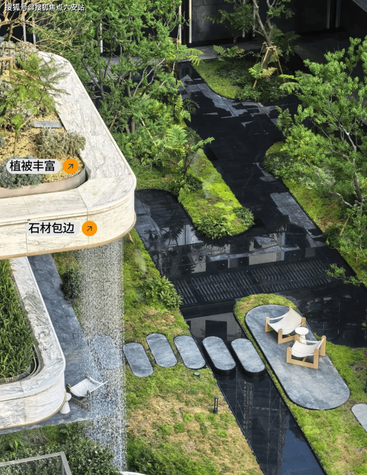 项目打破社区边界,将10亩市政公园与社区景观无界融合,打造主城罕见的垂直生态链。从地底垂瀑到空中云庭,从悬浮绿廊到浮岛会所,形成“地面-空中”多维生态体系。